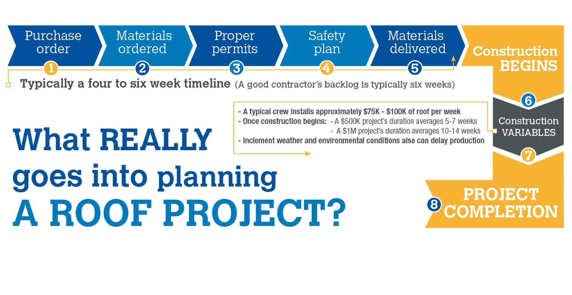 Your project timeline may be affected by factors like weather, material availability, details on the roof and your roof assembly. Depending on your roof’s size and complexity, it may take several weeks or months to complete the project.